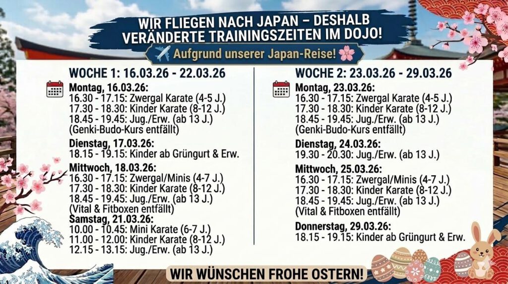 Vom 27.03.-06.04. (inklusive der ersten Osterferienwoche) ist das Dojo geschlossen.